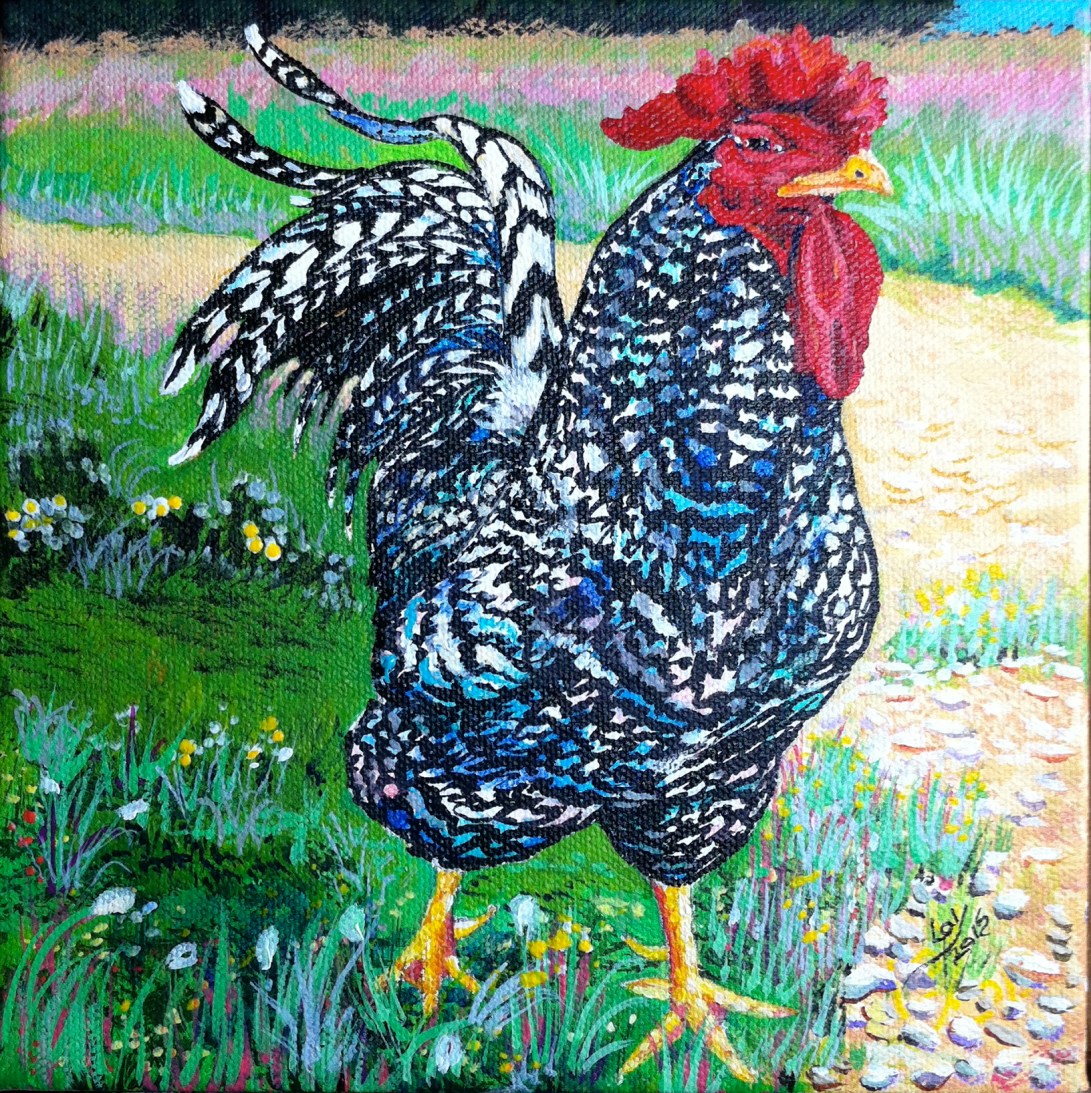 Captain Barred Rock – sold painting Year: 2015 Media: acrylic on canvas Size: 8″ x 8″ Previous exhibits: Art on 12 Gallery and Studios “Captain Barred Rock”