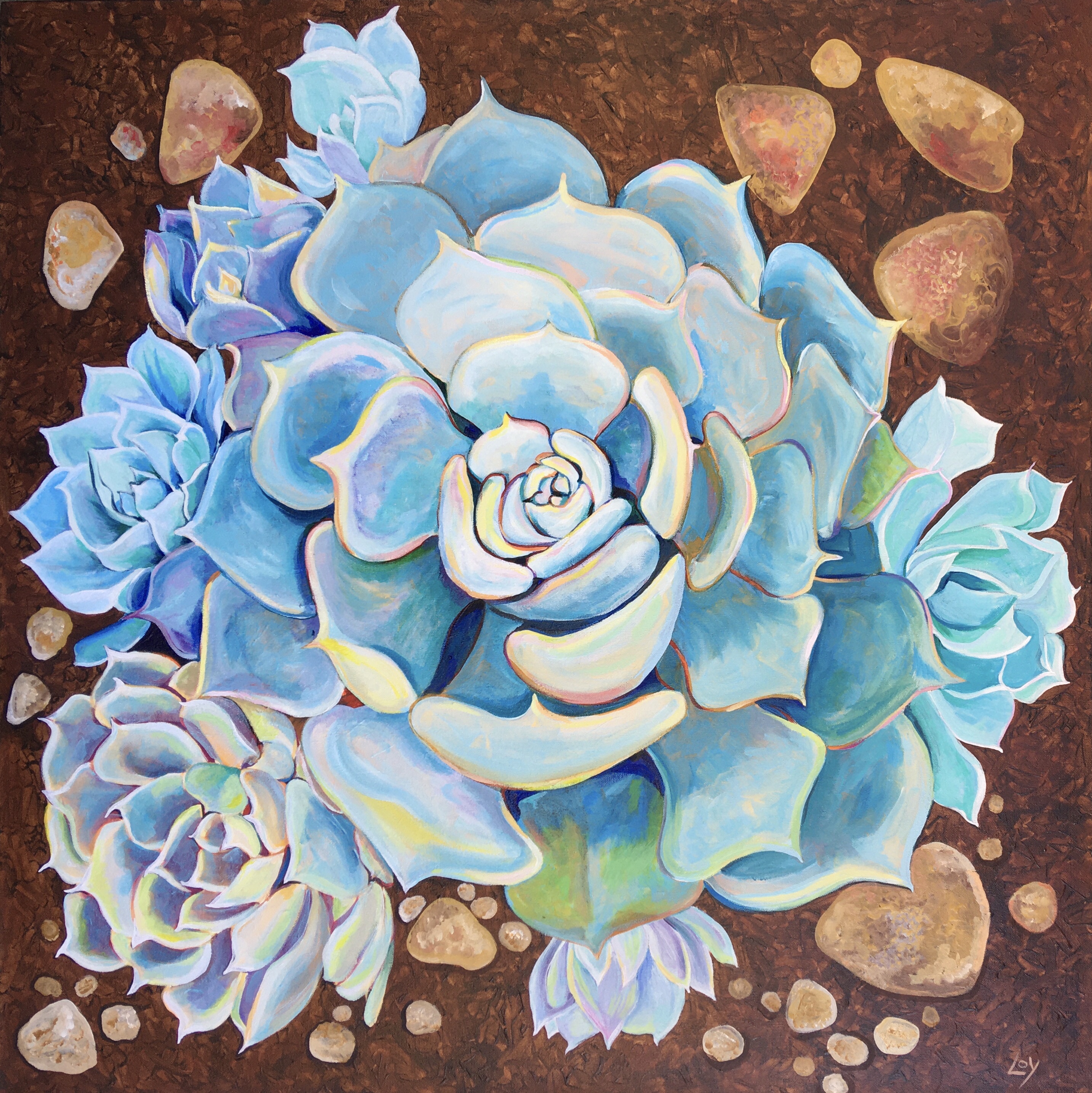 Echeveria ‘Encantada’-SOLD Media: Acrylics on wrapped canvasSize: 36″ x 36″ Echeveria-encantadablue succulent Plus taxes and shipping if needed$800.00 sharonloyanderson@gmail.com