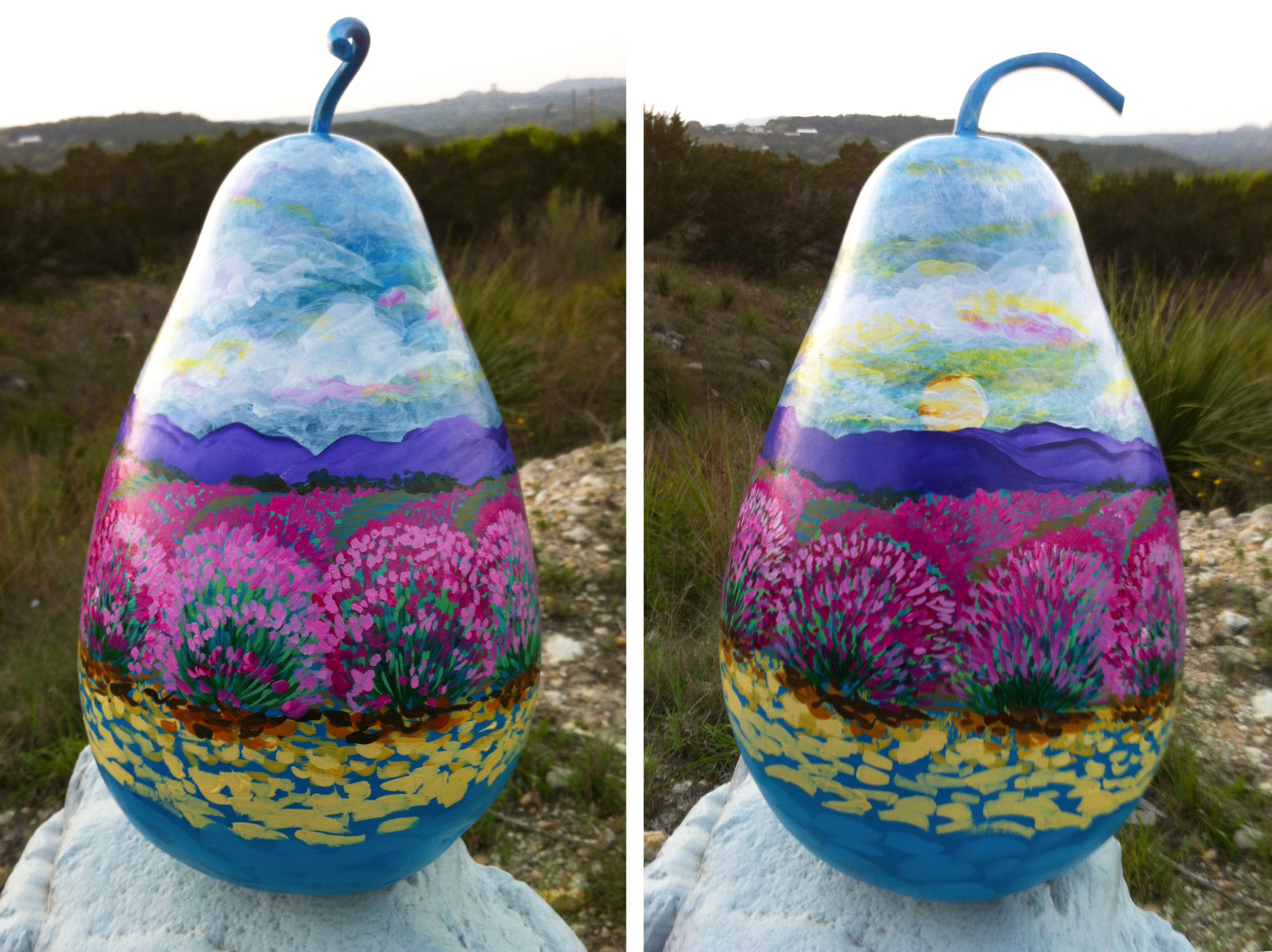 Lavender Fields – sold gourd painting Year: 2015 Media: acrylics on gourd Size: 13″ tall Price: SOLD Previous exhibits: The Oak Creek Cafe, Solstice Gardens “Lavender Fields”