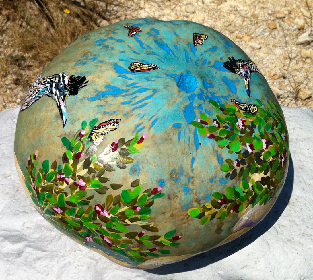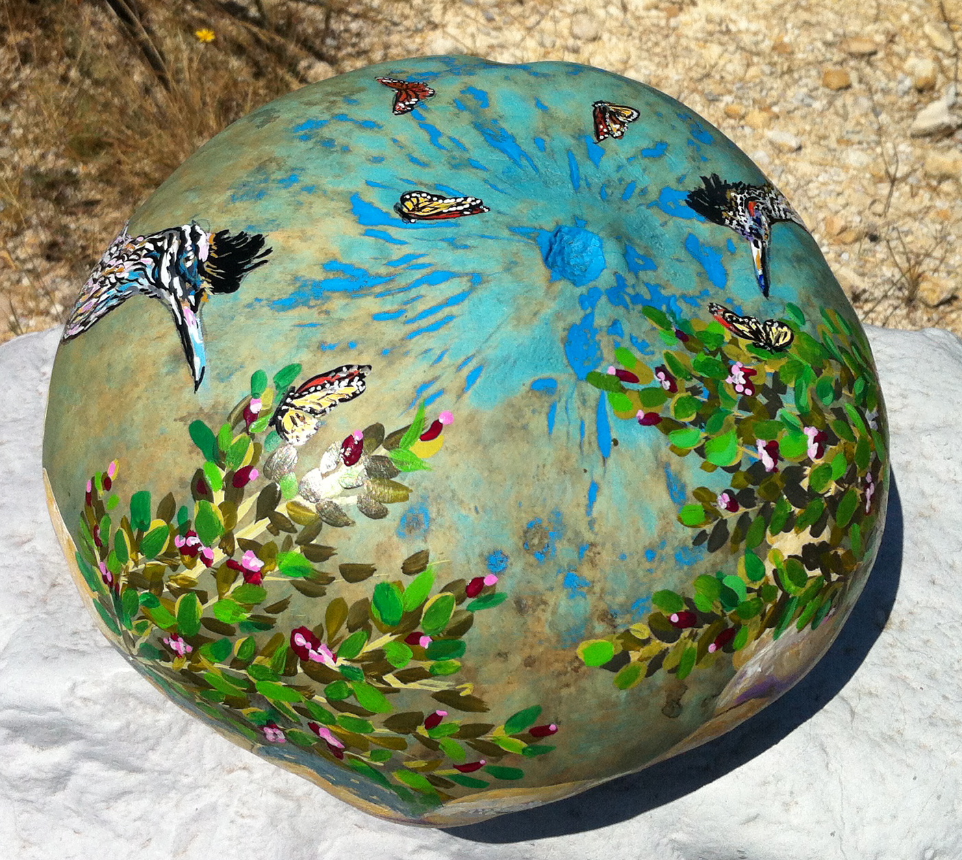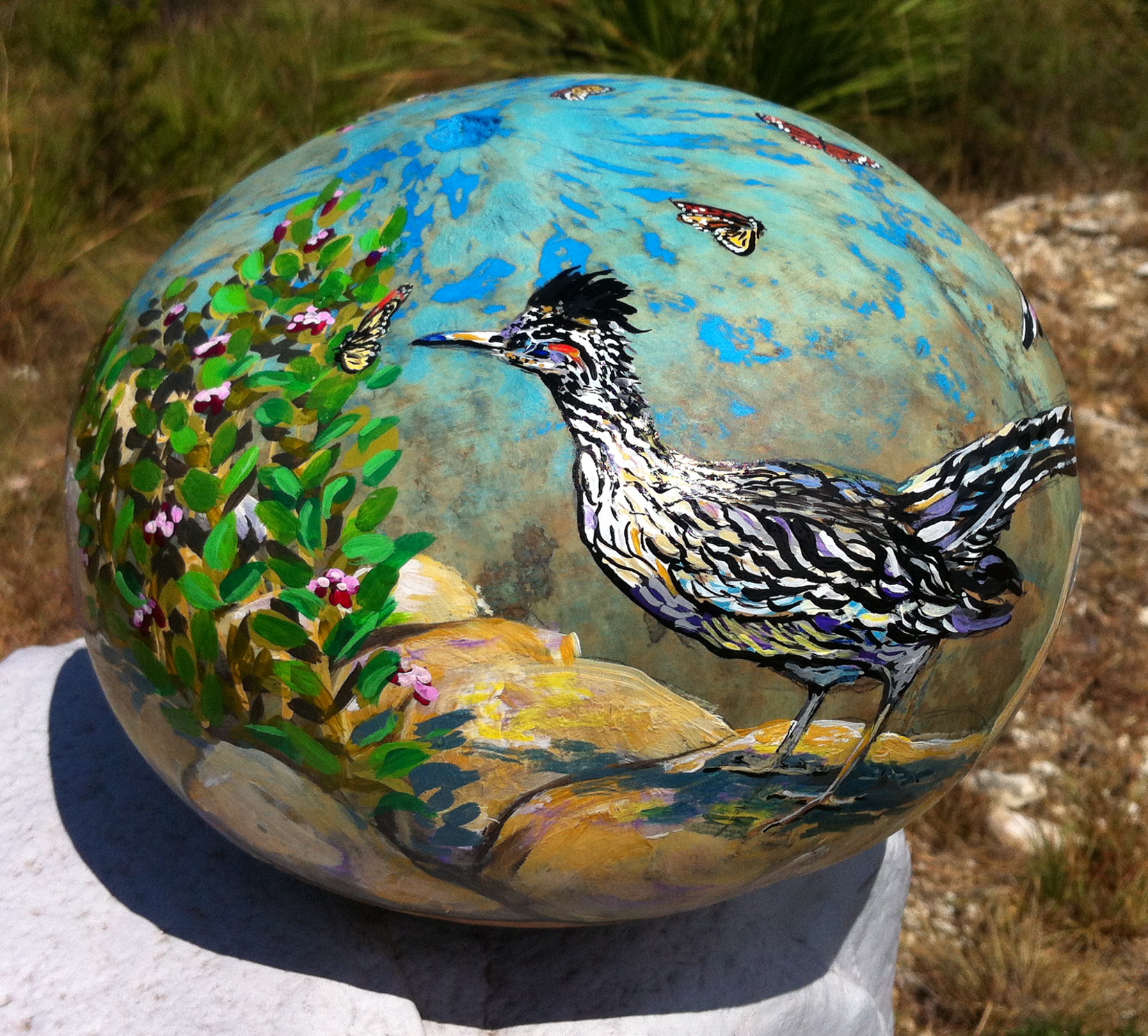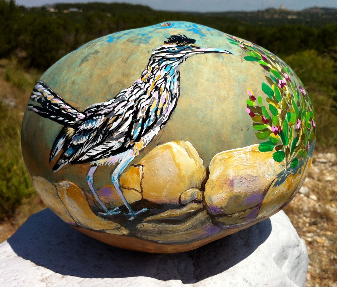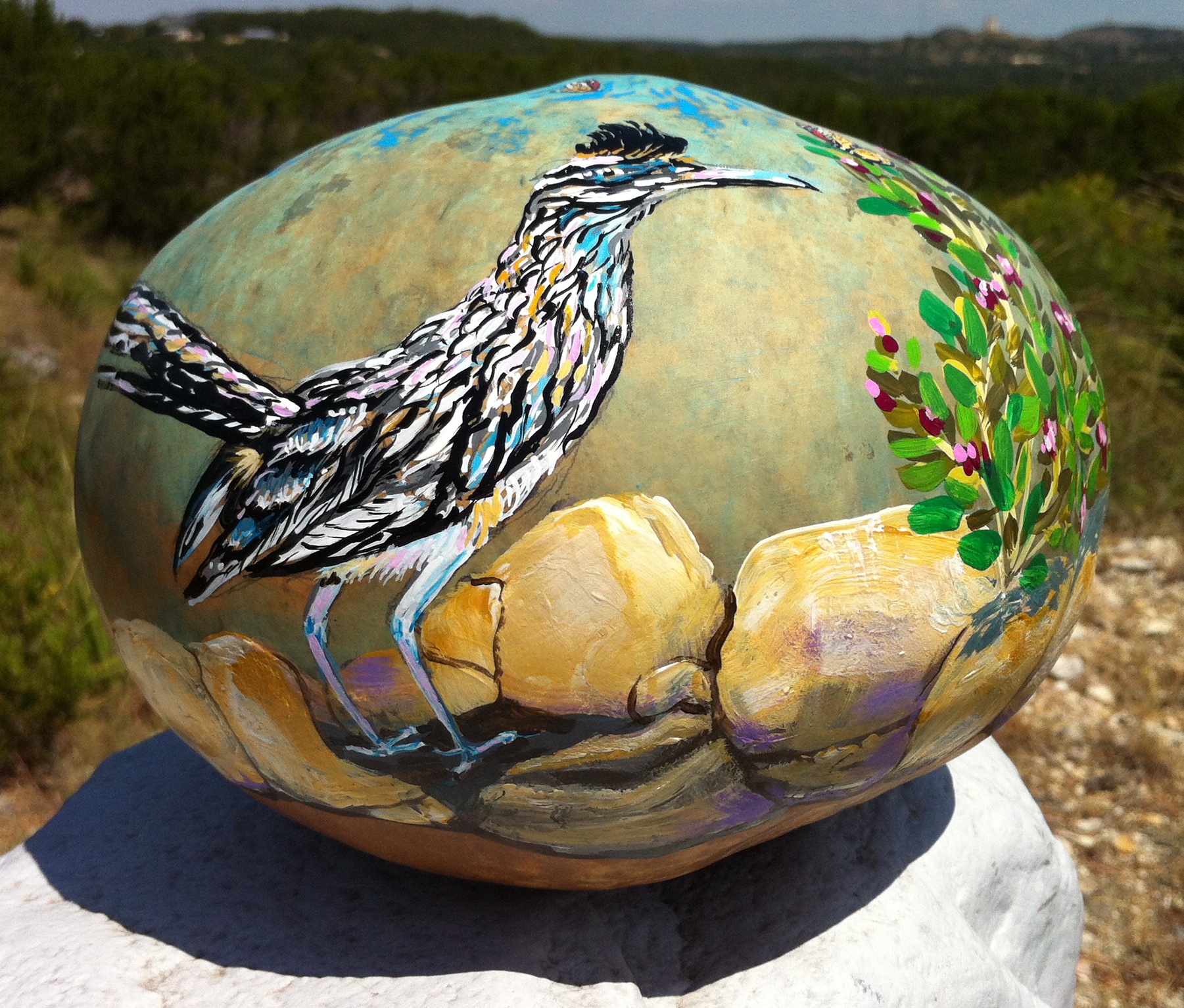 Roadrunners – sold gourd painting Year: 2015 Media: acrylics on bottle gourd Size: 7-1/2″ x 5″ “Roadrunners” “Roadrunners” “Roadrunners” “Roadrunners”